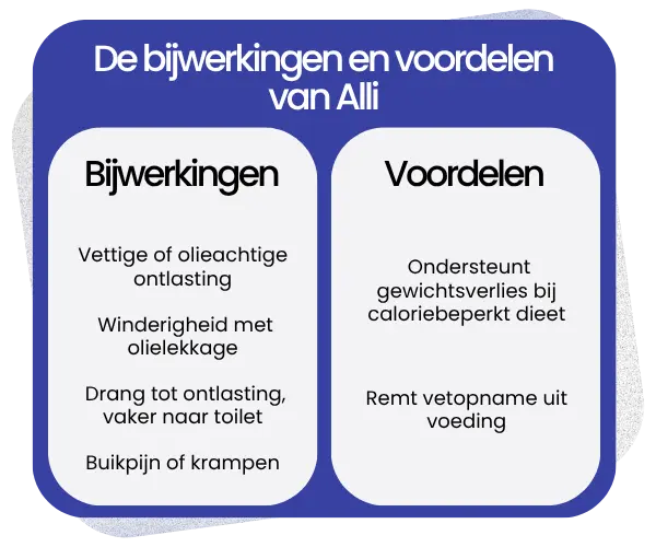 Alli werkt uitsluitend op vetten, en is dus niet werkzaam als uw voeding grotendeels uit koolhydraten en suikers bestaat. Daarom is een aangepast dieet—met gecontroleerde hoeveelheden vet—essentieel om bijwerkingen te minimaliseren en resultaat te behalen.