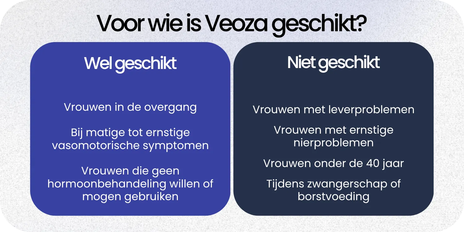 Veoza is bedoeld voor vrouwen vanaf ongeveer 45 jaar bij wie de natuurlijke overgang is ingetreden en die hinder ondervinden van matige tot ernstige vasomotorische symptomen. Alleen een arts kan bepalen of dit middel geschikt is voor u aan de hand van uw medische voorgeschiedenis.