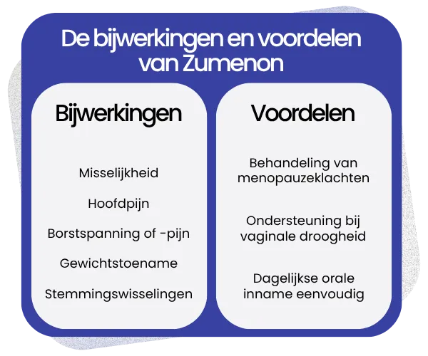 Zoals bij alle geneesmiddelen kan ook Zumenon bijwerkingen veroorzaken. Niet iedereen ervaart deze, maar het is belangrijk om op klachten te letten.