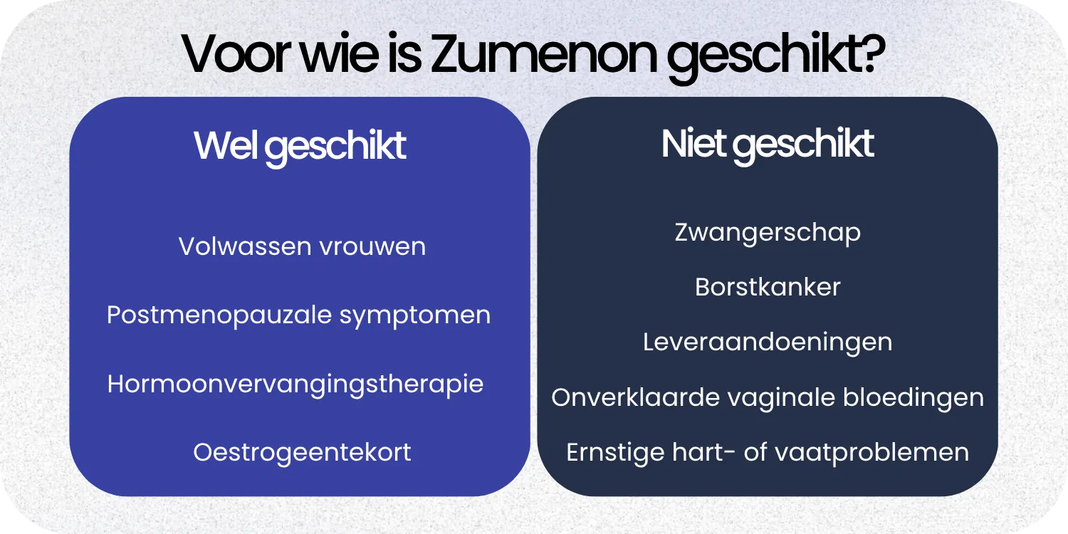 Zumenon is geschikt voor postmenopauzale vrouwen die hinder ondervinden van ernstige overgangssymptomen en bij wie geen contra-indicaties aanwezig zijn. Vóór aanvang van de behandeling vindt altijd een medische beoordeling plaats.